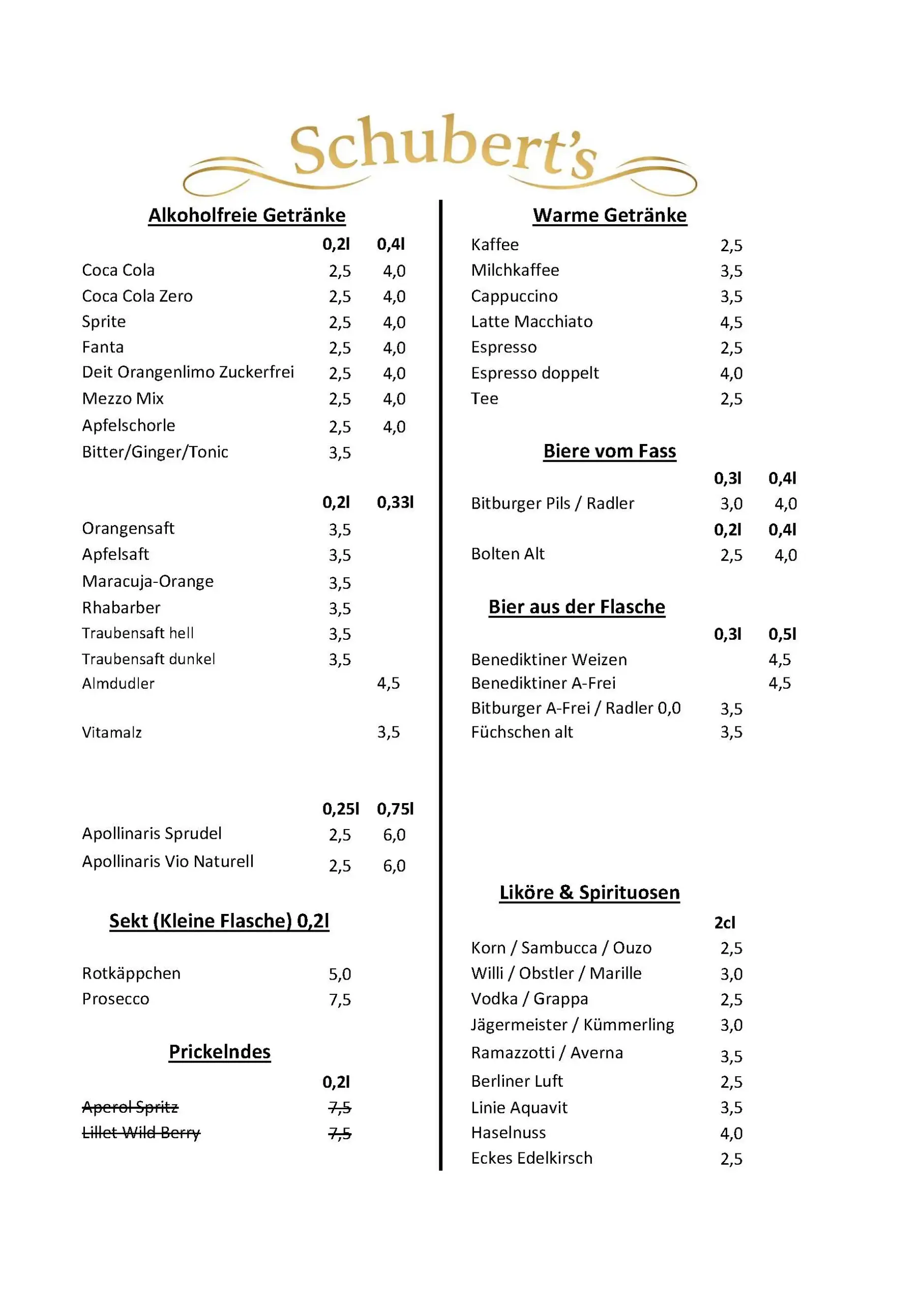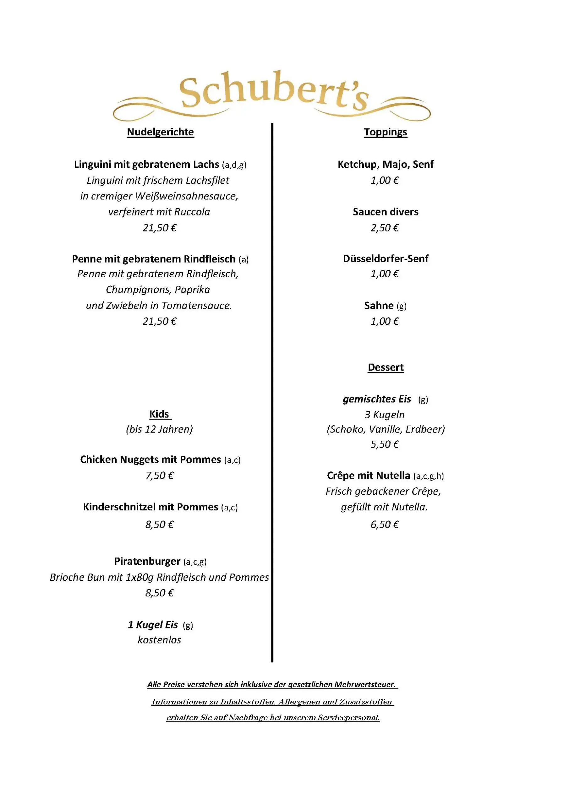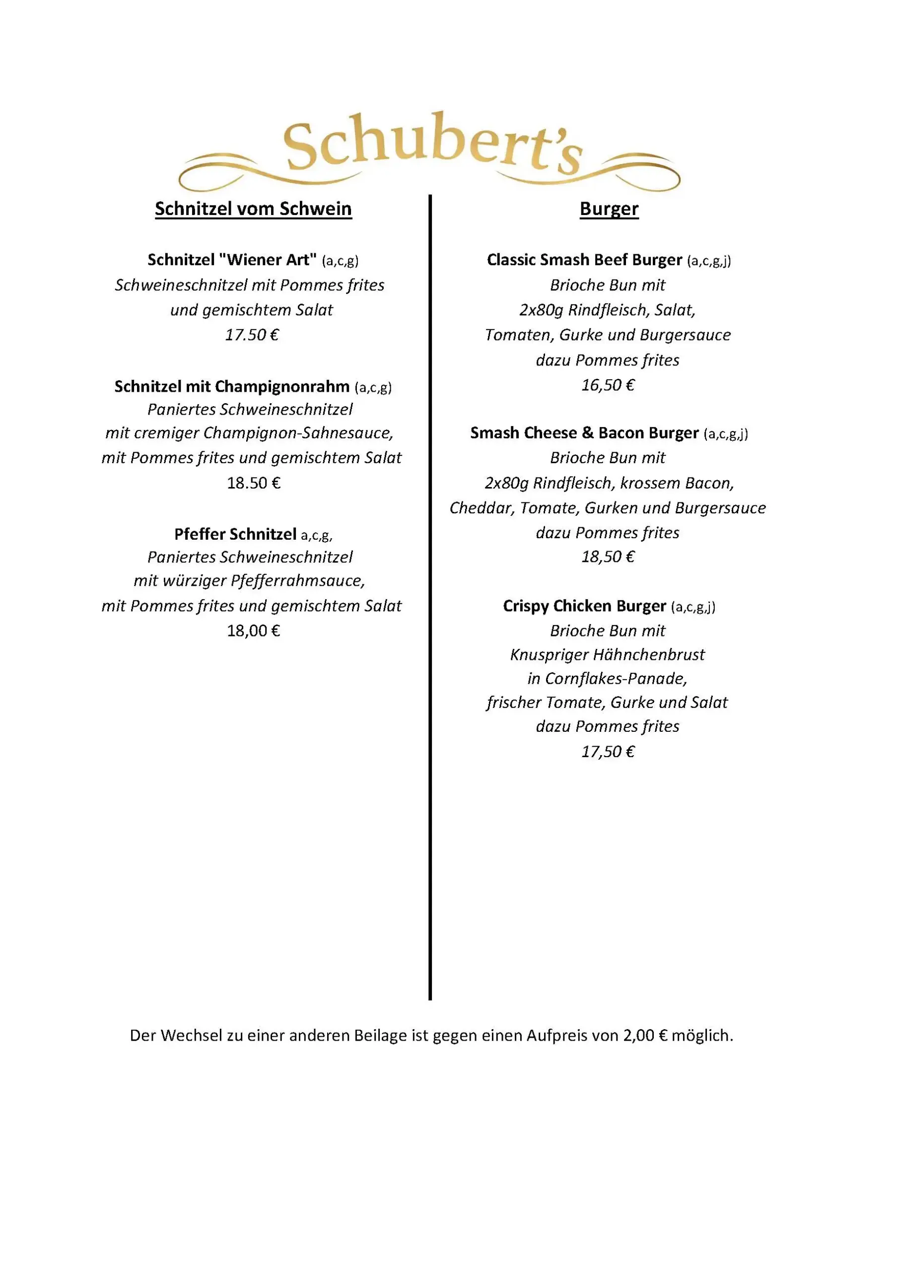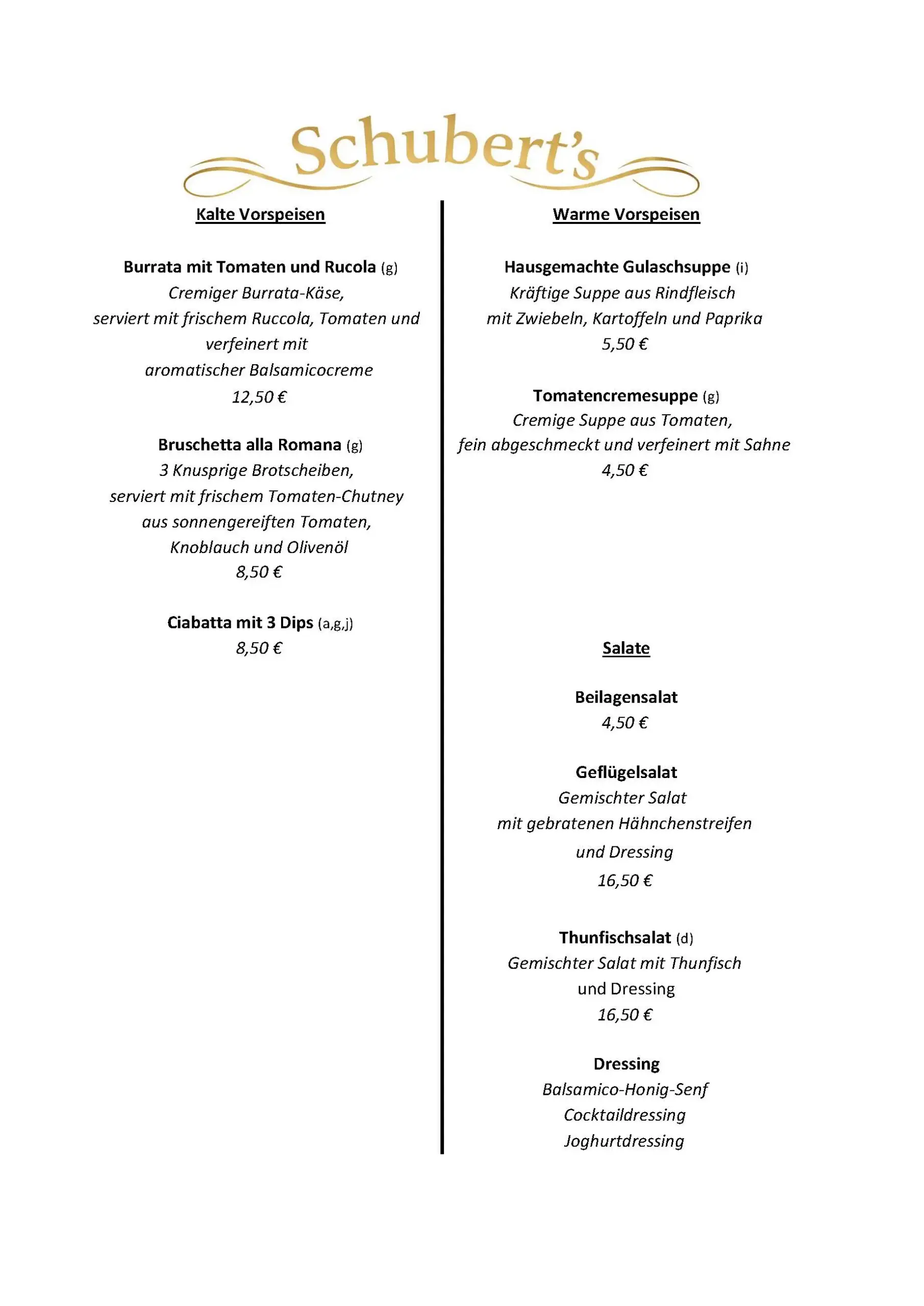 Schubert´s – die Speisekarte
